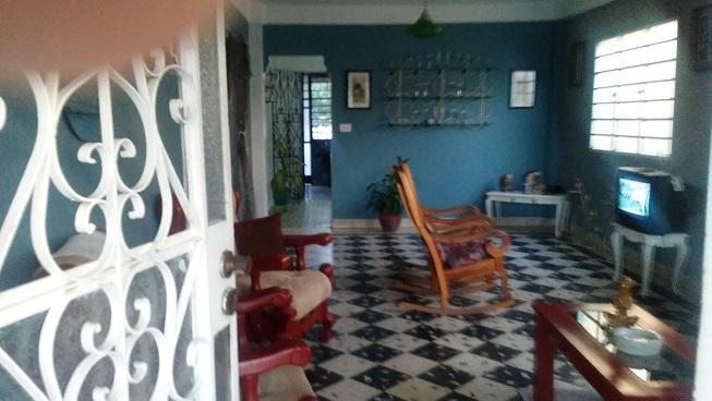 La casa consta de Portal, garage, sala grande, 2 cuartos, 2 baños, cosina, terraza, patio con árboles frutales bien cercado, y arriba un apartamento, que tiene cosina, baño, cuarto.