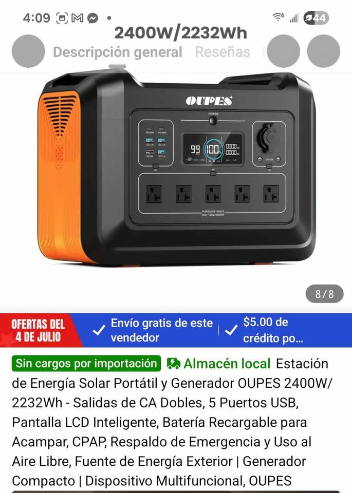 Estación de energía portátil oupes con una potencia de salida de 2400w y una potencia máxima de 5000w. Tiene una capacidad de 2232 Wh. Batería LifePO4 con más de 3500 ciclos de vida lo que se traduce en casi 10 años de durabilidad.