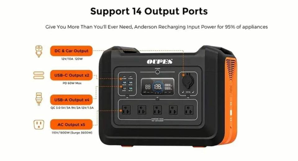 Tiene 14 puertos de salida ( 5 de AC, 4 USB-A, 2 Tipo-c, 1 de coche, 2 CC.).