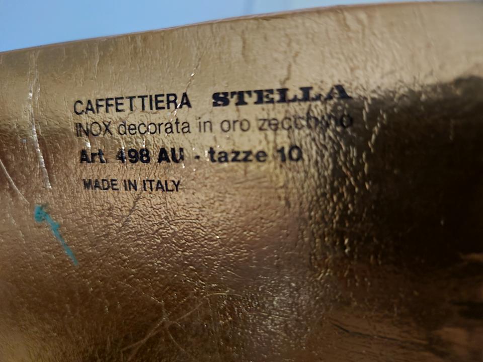 Cafetera Stella original italiana de lujo de acero inoxidable cromado y dorada, de 10 tazas. Pago en divisa o equivalente.