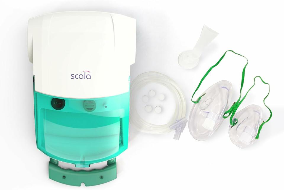 El inhalador scala SC 9420 con su compresor y nebulizador RF Plus es un sistema de inhalación eficaz para el uso de aerosoles medicinales en el tratamiento de enfermedades de las vías respiratorias superiores e inferiores. El inhalador SC 9420 es un dispositivo compacto de sobremesa con conexión a la red eléctrica. El tamaño de las partículas depende de la viscosidad del medicamento. Según la MMAD (EN 13554-1), el tamaño medio de las partículas es de 4 µm. La fracción respirable a <5,0 µm es del 80%.